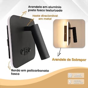- Arandela sobrepor LED Preta com USB e USB-C - Design Moderno e Funcionalidade na Medida Certa
