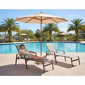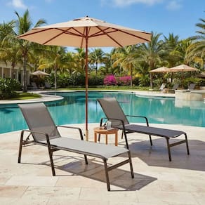 Aproveite momentos de lazer com conforto e praticidade com o Kit 2 Espreguiçadeiras Sevilha Tela Sling em Alumínio + Guarda-Sol com Base.