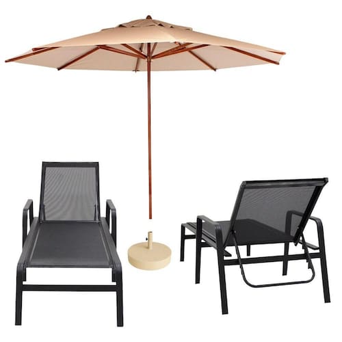 O guarda-sol de 3,00m em madeira com base em concreto de 40kg inclusa garante sombra e proteção, tornando o kit perfeito para áreas externas como piscinas, varandas, jardins e áreas gourmet.