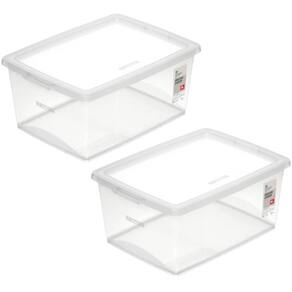 Garantia: 90 dias / Peso total: 1,080kg / Cor predominante: transparente / Ref: 7798139644969; Dimensões de cada caixa: 29,5cm (C) x 41,2cm (L) x 18,6cm (A); Capacidade de cada caixa: 15 litros; Material: polipropileno; Conteúdo: 2 caixas organizadoras de plástico 15L.