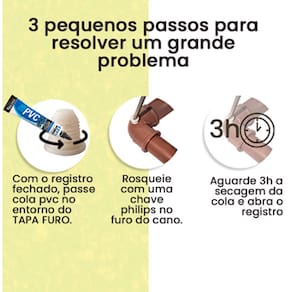 COMO USAR: 1) Feche o registro de água 2) Identifique a medida ideal de Tapa-Furo para o seu furo 3) Passe cola de PVC em volta do TAPA-FURO 4) Rosquear com uma chave phillips no furo do cano 5) Aguarde por 3 horas a cola secar 6) Abra o registro de água e pronto