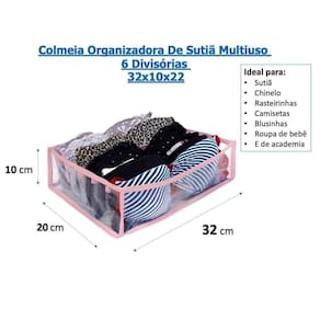 2 duas Colmeia Organizadora De Sutiã Multiuso 6 seis Divisórias 32x10x22 Transparente Com Viés Rosa Com praticidade e organização, tamanho certo, arrume seu guarda-roupa com colmeia de 6 divisórias e ganhe mais tempo para você Organizador em Colmeia Cristal 6 seis nichos permite melhor visualização e organização de suas roupas e peças íntimas, facilitando o seu dia a dia. Possui boa sustentação para acomodar as roupas, costuras reforçadas o que garante maior durabilidade. É confeccionado em plástico PVC, material resistente e transparente. Ideal para sutiã com bojo, chinelos, rasteirinhas, camisetas, blusinhas, roupa de academia, toalhinhas, roupinhas de bebê, meias, calcinhas, dentre outros. Com nossa colmeia organizadora, suas roupas estarão sempre no lugar certo e fáceis de encontrar. Organizador de sutiã cristal com rosa Tamanho: 32x21x10 6 divisórias Marca: VB Home Material resistente: PVC cristal transparente de alta qualidade Limpeza: Limpar tudo com pano úmido. Não utilizar produtos químico. Excelente também para ser em organização de espaço por Personal Organizer. Temos organizadores de vários tamanhos, na dúvida consulte-nos. Podemos montar anúncios específicos para você. Estamos à sua disposição Marca: Não Informado Ean: 7908788501067