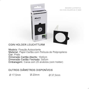 O Coins Holder Autocolante é uma importante ferramenta para armazenar e proteger suas Moedas.Os porta-moedas Coins Holder Leuchtturm protegem perfeitamente suas moedas de quaisquer influências do ambiente externo, graças à película utilizada que não contém amaciadores químicos.O Coins Holder tem como função proteger sua moeda:- evita o contato com o ambiente externo- evita o manuseio incorreto da peça (sem luvas ou com a mão suja)- facilita a exposição de sua peça na sua coleção- facilita a logística de sua peça, permitindo que você leve em eventos ou para negociar com mais praticidade e proteção- excelente organizador, pois centraliza a moeda no bolso da folha, deixando sua exibição muito mais bonita, organizada e apresentávelO Coins Holder Leuchtturm é produto de fabricação na Alemanha, e é conhecido por sua qualidade no material e em proteger as moedas. Diferente de qualquer outro Coins Holder, o Leuchtturm possui uma "pequena aba" utilizada para "empurrar" o Coins Holder, facilitando seu manuseio. Para isso, utilize as folhas adequadas para estes Coins Holders.No critério de organização, o Coins Holder se destaca ao promover a padronização da exposição de suas moedas. Tenha uma apresentação muito mais bonita e profissional utilizando Coins Holders.CARACTERÍSTICAS:Modelo: Fixação AutocolanteMaterial: Papel Cartão Preto com Película de PolipropilenoDimensão Cartão Aberto: 10x5cmDimensão Cartão Fechado: 5x5cmDiâmetro deste Anúncio: Ø 20mmEmbalagem: Caixa com 25 alvéolos (coins holder) cada caixaSUGESTÃO DE ARMAZENAMENTO DO COINS HOLDER COM A MOEDAO Coins Holder pode ser armazenado em folhas próprias para coleções de Moedas respeitando o espaço mínimo de 5x5cm cada bolso onde o holder será colocado, caixas organizadoras e separadoras, estojos (cartelas dobráveis) próprios para Coins Holders.COMO UTILIZAR:1- Para utilizá-lo você deve primeiramente dobrar ao meio, na marcação indicada, para facilitar o fechamento com a moeda.2- Em seguida, você deverá posicionar a moeda no centro do Coins Holder, em cima da película de plástico, onde a moeda será exibida. Certifique-se de que sua moeda está perfeitamente alinhada com alguma das laterais do Coins Holder pois após fecha-lo, não conseguirá mais mover a moeda.3- Dobre o coin holder ao meio, por cima da moeda, envolvendo-a completamente até colar. Marca: Leuchtturm
