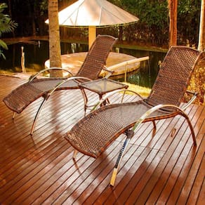 TRAMA 02 Espreguicadeiras Caioba Regulaveis em Aluminio 01 Mesa Garden de As Espreguicadeiras Caioba sao pensadas para atender especificamente a sua Area de Piscina, Lazer e Jardim. Sao 6 Niveis de Regulagem que possuem e deitam por completo para o seu conforto ao tomar sol. Observacoes: Voce podera levar as Espreguicadeiras tranquilamente para o Mar, Rio ou Piscina. Nao tem problema colocar ela dentro dagua nestes locais, apenas recomendamos que apos colocar, lavar as pecas por completo e com agua corrente e sabao neutro. Para retirar quaisquer particulas que possam causar algum dano nas Fibras. Lembrando que a estrutura e em Aluminio, nao ira enferrujar! As Fibras Sinteticas possuem protecao contra as acoes do tempo e Raios UV. ESPECIFICACOES COMPLEMENTARES: Nossos produtos sao de altissima qualidade e com design moderno, garantindo assim conforto e praticidade para seu bem-estar. Produzidos em estrutura de aluminio polido e revestida em fibra sintetica. Mais leve e resistente do que o Ferro, o Aluminio tambem pode ser molhado, pois nao enferruja. Possuem protecao UV, aumentando sua durabilidade contra acoes do tempo. Podendo ficar exposto a sol e chuva por bastante tempo. Ideais para decorar ambientes classicos e modernos como: Cozinha, Sala, Quarto, Varanda, Edicula, Piscina, Jardim, Area de lazer, Festa, Reuniao, Churrasco. Disponibilizamos diversas opcoes de cores. Fibra Sintetica especial - Resistente ao Sol e chuva com protecao UV. A fibra sintetica da Trama /UP Mobille e produzida com materiais de altissima qualidade. Essa caracteristica oferece resistencia suficiente para o movel ser em decoracoes de ambientes externos - sem preocupacoes com sol ou chuva. Estrutura em Aluminio ? Soldado na solda MIG, de alta resistencia, alta durabilidade e garantia de 1 ano de fabrica. Produzida em estrutura de aluminio polido, durabilidade cerca de 8 a 10 anos, material pode ser molhado e utilizado em areas abertas, exposto a sol e chuva. Design Moderno ? Combinacao em varios ambientes com tracos modernos e classicos, para todos os gostos! Facil de Limpar ? Utilize Sabao Neutro para a limpeza das fibras e estruturas. Para deixar o aluminio brilhoso, podera ser passado cera automotiva em pouca quantidade, mantendo assim o brilho de suas pecas. Passe um pouco de cera com um pano macio, logo em seguida, passe outro pano macio, porem seco para retirar a cera. Deixando assim, com o brilho novamente! MEDIDAS: Espreguicadeira: 0,36 ALT x 0,65 LARG x 1,95 PROF