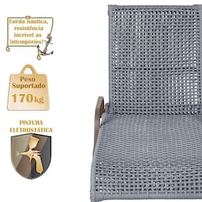 Produto conhecido como: Espreguicadeira reclinavel, Espreguicadeira em aluminio, Espreguicadeira com encosto ajustavel, Espreguicadeira para area externa, Espreguicadeira para piscina, Espreguicadeira resistente ao tempo, Espreguicadeira moderna, Espreguicadeira confortavel, Moveis para area externa, Moveis de aluminio para jardim, Corda nautica para moveis, Espreguicadeira leve e duravel, Design sofisticado para areas externas, Decoracao para varanda e piscina, Espreguicadeira resistente ao sol e chuva