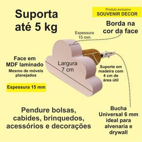 A face vai colada com super cola e acaba sendo apenas decorativa, pois é o suporte quem recebe o esforço, suportando até 5 Kg. Anúncio referênte à 2 unidades. Modelo: Nuvem Tamanho da face: 7,0cm X 4,5cm; Material: MDF laminado 15mm melamínico | borda pintada Cor: Rosa, Azul, Branco e Cinza