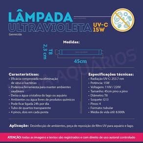 Lâmpada UV tubular fluorescente T8 germicida UV-C 15W para esterilização de ambientes, água e reposição filtro UVComposição do kit: 2 lâmpadas germicida de 15W T8 UV-C.Leia atentamente o anúncio antes da compra.Nossa lâmpada tubular germicida UV foi desenvolvida com tecnologia de ponta para garantir a mais alta qualidade e eficiência em desinfecção, é a escolha ideal para garantir um ambiente livre de germes e uma água cristalina para seu aquário ou lago.Principais Características:Eficácia comprovada na eliminação de bactérias, vírus e outros micro-organismos nocivosA lâmpada UV-C germicida é uma poderosa ferramenta para manter ambientes saudáveisDeixa a água cristalina do lago ou aquário Livre de produtos químicos, a luz UV-C não deixa resíduos tóxicos no ambiente, no ar ou na água tratadaPode ficar ligada 24h por diaTubular / linearTubo de quartzo transparente4 pinos, dois em cada pontaNecessita de reator próprio para lâmpada UVNecessita de equipamento próprio para desinfecção de ambientes ou um filtro UV para esterilização de águaNunca manuseie a lâmpada com ela ligada, não exponha olhos e pele à radiação da lâmpada. Aplicação - Para que serve a lâmpada ultravioleta - UV-C germicida:Peça de reposição para filtro ultravioleta UV de lago ou aquárioManter a água do aquário ou lago cristalina e livre de micro-organismos que possam prejudicar a saúde dos peixes e plantasTratamento de água e esgotoDesinfecção de ambientes como hospitais, farmácias, restaurantes, academias, transporte público, indústrias alimentícias e outros locais que necessitam manter o ambiente seguro e livre de patógenos.Especificações técnicas:Marca: Mega AquáriosModelo: Lâmpada UV UV-C germicida fluorescente ultravioleta 15WRadiação: Emite radiação UV de onda com um pico de 253.7 nm UV-C Potência: 15WVoltagem: 110V / 220V pode ser ligada nas duas voltagens conforme ligação do reatorTamanho: 45cm pino a pinoDiâmetro: T8Soquete: G13Pinos: 4Formato: tubularMédia de vida útil: 8.000hPeso: 64gNecessita reator específico para lâmpada fluorescente de 15W.A lâmpada germicida também pode ser conhecida como:Lâmpada UV-C, lâmpada germicida, GL, lâmpada esterilizadora, luz ultravioleta C, luz uv.Como usar a lâmpada UV ultravioleta para esterilizar água: É necessário a utilização de um esterilizador ou filtro UV, nunca coloque a lâmpada ultravioleta UV-C diretamente na água sem um equipamento próprio. A utilização de materiais para vedação como: silicone, Durepox e outros materiais semelhantes não garantem a vedação correta, podendo passar água para os pinos e consequentemente a queima da lâmpada, caracterizando uso indevido e a perda da garantia. Utilize sempre material apropriado como anéis de vedação de borracha.Como descartar a lâmpada UV corretamente:Procure pontos apropriados de coletas específicos para materiais reciclados como lâmpadas e resíduos eletrônicos.Nunca jogue lâmpadas tubulares no lixo comum, pois elas contêm metais pesados e outros materiais perigosos.IMPORTANTEJamais exponha os olhos ou a pele à radiação emitida pela lâmpada UV ultravioleta, sob risco de danos gravíssimos irreversíveis aos olhos além de queimaduras na pele. A utilização de equipamentos de segurança é obrigatória.Obrigado pela visita e boas comprasATENÇÃONossas imagens e textos são registrados e com direito de uso autoral controlado e reservado a essa loja e as lojas parceiras devidamente autorizadas em contrato.