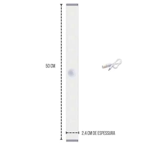 2 Lâmpadas Led 5W Barra 50Cm USB Sensor De Presença Adesivos Magnéticos Com Luz Branco Quente Para Closets Armários Luminária LED com formato de barra, com carregamento via USB, é ideal para serem utilizadas em guarda-roupas, armários, gavetas, corredores, varandas, escritórios, quartos, estantes, cabeceiras de camas, toaletes, espelhos, nichos, closets, escadas, balcões, escrivaninhas e em vários locais que necessitam de iluminação sem a necessidade de perfurações, parafusos e cabos. Especificações do produto:- Tensão de Entrada: DC 5V- Quantidade de Led: 44 LEDs- Cor do Produto: Branco- Cor da Luz: Branco Quente 3000K - Potência nominal: 0.5 a 5W- Corrente nominal: 0.3-1A- Ângulo de Indução: Até 120º- Distância da detecção de movimento: Até 4 metros- Material do produto: ABS e Alumínio- Dimensões do produto: Comprimento: 50cm x Largura: 2,4cm x Espessura: 2cm- Medida do cabo USB: Comprimento: 20cm- Tempo de carregamento: Entre 2 a 3 horas - No carregamento da luminária quando a luz vermelha apagar já está totalmente carregada- Peso da luminária: Aproximadamente 115 gramas cada peça- Duração da luz contínua: Até 3 horas e meia Atenção: Esse produto não é a prova de água, e também, não deverá ser instalado em lugar úmido. Não deverá ser ligada diretamente na energia elétrica 110/220v sem uma fonte de carregamento de 5v, caso contrário, o produto será danificado. Não acompanha nenhuma fonte de carregamento. Manual Rápido- Solte e cole um dos lados da fita dupla face na fita de metal, encoste agora a fita de metal na parte magnética da luminária, por fim solte a outra parte da fita dupla face e fixe no lugar desejado. Observe se o lugar está limpo e adequado para a fixação.- Para deixar a Luz Contínua - Pressione o Botão Liga/Desliga uma vez.- Para deixar em Modo de detecção de presença pressione o botão Liga/Desliga pela segunda vez até piscar 3 vezes e apagar. A luz permanece ligada após a saída de uma pessoa da área do sensor por 25 segundos.- Na função de sensor de presença, a luminária não acenderá se tiver luz por perto, ela acende somente no escuro.- Para desligar é somente pressionar o botão Liga/Desliga pela terceira vez.- Para controlar a intensidade do brilho da luminária pressione e segure o botão liga/desliga para ajustar de mais fraco a mais forte a iluminação. Itens inclusos:- 2 Luminárias com Sensor de Presença- 2 Cabos USB Tipo V8 para carregamento das luminárias- 4 Adesivos Magnéticos para fixação das luminárias no lugar desejado