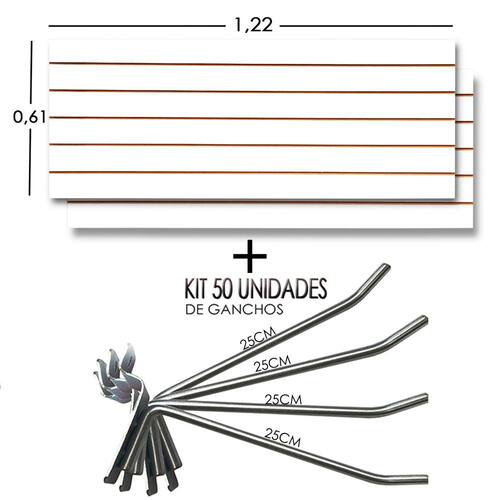 2 Painéis Canaletados de 1,22 X 0,61 + 50 Ganchos 25cmKit contendo 2 (DOIS) Painéis Canaletados Expositor em MDF, também conhecido como SlatWall. Ideal para todos os tipos de loja! + 50 unidades de ganchos ZINCADOS 25mO Kit permite que o comprador faça a instalação da maneira que melhor o convém! Isso se deve pela medida que pode compor peças maiores, adequando assim da melhor maneira para o seu negócio.DESCRIÇÃO:2 unidades de painel canaletado 1,22 X 0,61 + 50 Unidades de Ganchos ZincadosESPECIFICAÇÕES:Cor: Painel BrancoMaterial: MDFMedidas Aproximadas: Painel - Comprimento de 1,22 MT // Altura de 0,61 MT // Largura ou espessura : 18mm. INSTALAÇÃO / MONTAGEM:1. Montado no sistema de parafusos direto na parede. (Parafusos e buchas não inclusos) ITENS INCLUSOS:- 2 Painel em MDF 1,22 x 0,61 MT (Parafusos e buchas NÃO inclusos)- 50 Unidades de ganchos zincados.