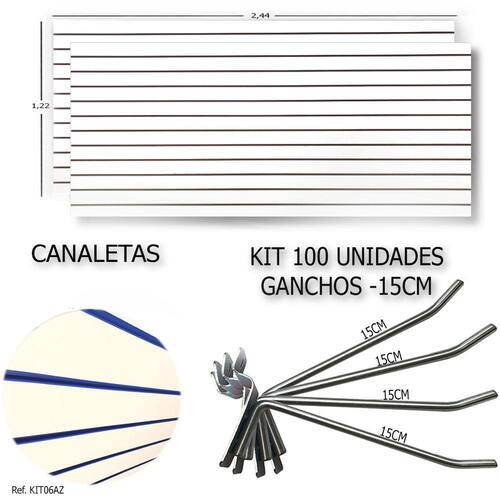 2 Paineis Canaletados - 2,44 x 1,22 + 100 ganchos 15cm + Canaleta AzulPainel Canaletado Expositor em MDF, também conhecido como SlatWall, é utilizado para exposição organizada de produtos dos mais diversos segmentos.O Kit com 2 unidades de painel na medida de 2,44 x 1,22 permite que o comprador faça a instalação da maneira que melhor o convém! Isso se deve pela medida que pode compor peças maiores, adequando assim da melhor maneira para o seu negócio.DESCRIÇÃO:2 Paineis Canaletados - 2,44 x 1,22 + 100 ganchos 15cm + Canaleta AzulESPECIFICAÇÕES:Cor: Painel BrancoMaterial: MDFMedidas Aproximadas: Painel - Comprimento de 2,44 MT // Altura de 1,22 MT // Largura ou espessura : 18mm.INSTALAÇÃO / MONTAGEM:1. Montado no sistema de parafusos direto na parede. (Parafusos e buchas não inclusos)ITENS INCLUSOS:- 2 Paineis em MDF 2,44 x 1,22 MT (Parafusos e buchas NÃO inclusos)- 100 unidades de ganchos zincados- Canaletas Azul (Já seguem instaladas no painel)