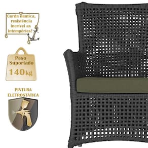A corda nautica adiciona um toque de rusticidade moderna, enquanto o estofado impermeavel garante que sua poltrona esteja sempre impecavel, mesmo apos uma chuva inesperada ou um acidente com liquidos.