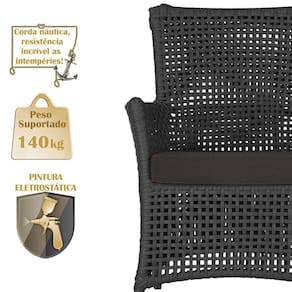 A corda nautica adiciona um toque de rusticidade moderna, enquanto o estofado impermeavel garante que sua poltrona esteja sempre impecavel, mesmo apos uma chuva inesperada ou um acidente com liquidos.