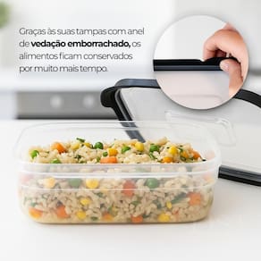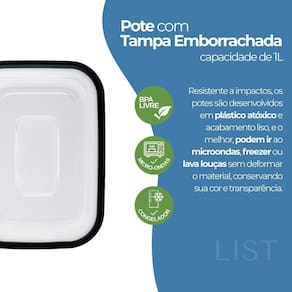 2 Pote Transparente tampa preta 1000ml Kit 2 Potes Retangulares 1000ml Preto com Tampa Vedada O kit com 2 potes retangulares de 1000ml na cor preta oferece praticidade, resistência e ótimo aproveitamento de espaço. Ideal para armazenar marmitas, alimentos em porções maiores ou organizar a geladeira e o freezer. Cada pote possui tampa com vedação firme, que ajuda a conservar os alimentos por mais tempo e evita vazamentos. O material é plástico atóxico, resistente a impactos e próprio para uso no dia a dia. Os potes podem ser utilizados com segurança no micro-ondas, freezer e lava-louças. Características: Capacidade de 1000ml por pote Tampa com vedação emborrachada Indicado para armazenar alimentos e marmitas Pode ser no micro-ondas, freezer e lava-louças Cor preta com acabamento moderno Material resistente e durável Dimensões de cada pote: Altura: 73 mm Largura: 189 mm Comprimento: 142 mm Conteúdo da embalagem: 2 potes plásticos retangulares de 1000ml com tampa Deseja isso também Marca: Não Informado