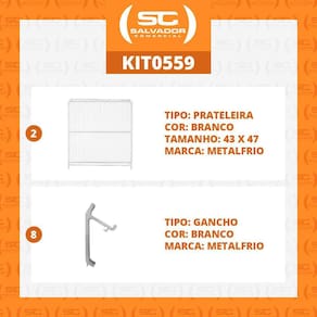 Componentes do kit:- 2 prateleiras branca visa vn25/28 vb25/28 vf28 - metalfrio- 8 ganchos - metalfrioPara aumentar suas vendas, acondicione mais produtos em seu cervejeiro ou refrigerador.Grades moduladas com pintura epóxi, de altíssima resistência e praticidade.Para ter uma melhor mobilidade, foram criados ganchos, que trazem mais facilidade e segurança.Modelos compatíveis conforme imagem do anúncio metalfrio:- vn28fp- vn28fe- vn28te- vn25te- vn28tp- vn25tp- vb28rb- vb25rb- vf28f- vb25r- vb28rFicha técnica:- grade: estrutura em aço carbono, com pintura epóxi. 2 unidades - gancho: alumínio 8 unidades - cor: branco- medidas totais: 4 cm a x 43 cm l x 47 cm p- medidas da embalagem: 8 cm a x 45 cm l x 50 cm p- peso: 1,2kg- peso embalado: 3,0kg