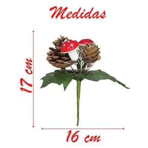 Possui 2 Ramos, com 2 Cogumelos, 2 Pinhas, cada. Altura: 17 cm Cor: Verde,Vermelho Material: Plástico.