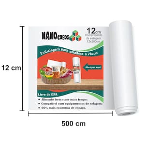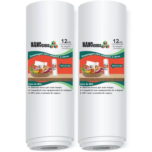 2 Rolos Nanocubos 12x500cm Sacos Ranhura para Seladora A Vácuo Embalagens 2 rolos NANOCUBOS 12 cm X 500 cm para seladoras a vácuo. Embalar produtos a vácuo é a melhor forma de mantê-los sempre protegidos por muito mais tempo. Ao embalar alimentos, a validade deles é completamente estendida, pois eles não terão nenhum contato com o ar e serão pouco afetados pela ação do tempo. Você pode embalar tanto alimentos crus como alimentos já preparados para serem consumidos em outro momento. Você economiza muito dinheiro e evita o desperdício Os sacos para vácuo Nanocubos são produzidos com alta tecnologia em Nylon Poli seguindo padrões de qualidade internacional. Possuem 12 micras, 3 barreiras de proteção, sem presença de BPA Não tóxicos e funcionam com equipamentos de embalagens a vácuo. Além de alimentos, é possível utilizá-lo com objetos pessoais, documentos ou utensílios, conservando-os como novos por muito tempo e aumentando sua vida útil.
