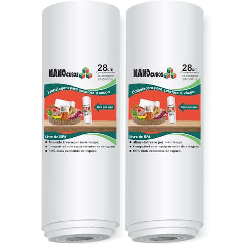 2 Rolos Nanocubos 28x500cm Sacos Ranhura para Seladora A Vácuo Embalagens 2 rolos Nanocubos 28 cm X 500 cm para seladoras a vácuo. Embalar produtos a vácuo é a melhor forma de mantê-los sempre protegidos por muito mais tempo. Ao embalar alimentos, a validade deles é completamente estendida, pois eles não terão nenhum contato com o ar e serão pouco afetados pela ação do tempo. Você pode embalar tanto alimentos crus como alimentos já preparados para serem consumidos em outro momento. Você economiza muito dinheiro e evita o desperdício Os sacos para vácuo Nanocubos são produzidos com alta tecnologia em Nylon Poli seguindo padrões de qualidade internacional. Possuem 12 micras, 3 barreiras de proteção, sem presença de BPA Não tóxicos e funcionam com equipamentos de embalagens a vácuo. Além de alimentos, é possível utilizá-lo com objetos pessoais, documentos ou utensílios, conservando-os como novos por muito tempo e aumentando sua vida útil. Características do produto: - Aparência: Transparente com ranhuras; - Forma disponível: Rolos, é possível montar sacos do tamanho que quiser; - Quanto ao uso: Reciclável pode utilizar várias vezes seguidas; - Iniciação ao rasgo: Difícil; - Propagação ao rasgo: Difícil; - Temperatura máxima de uso: 120 C; - Resistência a ácidos: Excelente mantendo o cheiro do alimento; - Resistência a óleos e gorduras: Excelente; - Segurança alimentar: Conserva o alimento. Conteúdo da Caixa 2- Rolos 28 cm X 500 cm. Políticas da loja: - : contra defeitos de fabricação, 90 dias; - Prazo de envio: imediato após a confirmação do pagamento; - Cancelamento: Realizamos a devolução total do dinheiro; Qualquer dúvida estamos à disposição Ean: 7896296916278