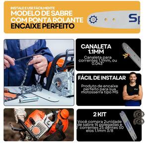 Comprimento: 14 35 cm Passo da corrente: 3/8 Espessura do canal: 1.1 mm 0.043 Dentes: 25 Material: Aço de alta resistência com tratamento anticorrosivo Encaixe: Compatível com Stihl MS 170, MS 180 Tipo de ponta: Rolante menor atrito, maior vida útil