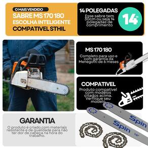 Comprimento: 14 35 cm Passo da corrente: 3/8 Espessura do canal: 1.1 mm 0.043 Dentes: 25 Material: Aço de alta resistência com tratamento anticorrosivo Encaixe: Compatível com Stihl MS 170, MS 180 Tipo de ponta: Rolante menor atrito, maior vida útil