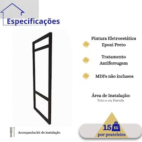 Especificações Técnicas Suporte Tubo Metalon Quadrado: 15x15 Profundidade para Madeira: 25cm Resistencia: até 15 kg por nivel de prateleira Distância entre prateleiras: 1º Nivel ao 2º Nivel: 13,5cm 2º Nivel ao 3º Nivel: 32,5cm Area de Instalação: Parede e ou Teto