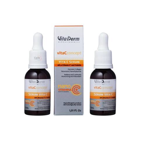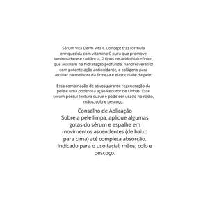 Vita Derm Vita C Concept Sérum de Linhas para todos os tipos de pele. vita Derm Vita C Concept promove hidratação, revitaliza a pele e uniformiza o tom. Sérum Vita Derm Vita C Concept traz fórmula enriquecida com vitamina C pura que promove luminosidade e radiância, 2 tipos de ácido hialurônico, que auxiliam na hidratação profunda, nanoresveratrol com potente ação antioxidante, e colágeno para auxiliar na melhora da firmeza e elasticidade da pele. Essa combinação de ativos garante regeneração da pele e uma poderosa ação de Linhas. Esse sérum possui textura suave e pode ser no rosto, mãos, colo e pescoço. Marca: Não Informado