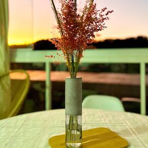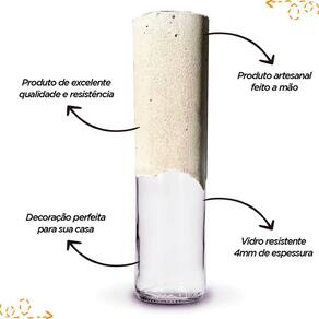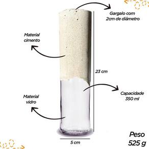Especificações: Altura: 23 cm Largura: 5 cm Diâmetro: 5 cm Peso: 525 g Itens inclusos: 2 - Vaso decorativo de cimento e vidro Qualquer duvida estamos a disposição!