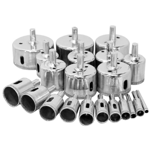 21 Brocas diamantadas revestidas que furam um círculo completo em vidros mármores granitos espelhos garrafas pisos azulejos cerâmicas e madeiras.Desenvolvida para ser usada com água.Nunca deve ser usada à seco para não estragar o diamante de corte. Tamanhos 60/55/50/45/42/40/38/35/32/30/28/25/22/20/18/16/14/12/10/8/6 mm.