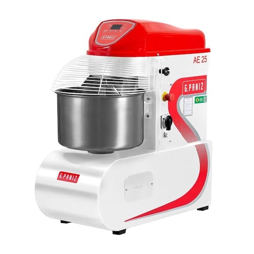 A masseira espiral é o equipamento ideal para a produção de massas em regime de trabalho intenso, com baixo nível de ruído, misturando a massa com cuidado, desenvolvendo a estrutura do glúten e atingindo o ponto de véu. Para a produção dos mais variados tipos de massas pesadas de panificação, como pães (francês, baguette, sírio, italiano, caseiro, de forma, integral, hambúrguer e artesanal), panetones, donuts, brioches, croissants, empadas e pizzas. Equipamento certificado pelo OCP 0070 conforme Portaria Inmetro 148/2022. Normas especificas: ABNT NBR NM 60.335-1 IEC 60.335-2-64 Característica: Fabricadas em aço carbono SAE 1020 com acabamento em pintura epóxi, cuba em aço inox 304 e batedores em ferro fundido. Descrição do Produto: Painel de controle frontal superior; Painel ANALÓGICO na versão de UMA velocidade, monofásica, com botão de liga/desliga/reset; Mecânica resistente e silenciosa por correias e correntes; Motor potente; Ampla abertura da grade, facilitando o manuseio; Cuba giratória em aço inox 304, estampada em peça única; Batedor espiral em ferro fundido; Medidas em Centímetros: Altura: 103 Largura: 49 Comprimento: 96 Peso (Kg): 146 Dados Técnicos: Capacidade de Produção (Kg): 25 Tempo de Preparo (Minutos): 12 à 20 Velocidades: 1 Rotações do Batedor: Velocidade 1 (Rpm): 209 Potência do Motor (CV): 3,0 Consumo do motor (Kw/h): 2,86 Tensão (Voltagem): Mono 220V Obs.: Equipamento produzido também na versão Inox.