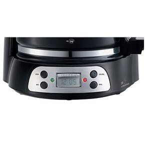 Com capacidade para o preparo de 38, display digital e timer programável com até 24h de antecedência. Além disso, sua placa de aquecimento com termostato conservará a temperatura e o sabor original do seu café, e o dispositivo corta-pingos permite retirar a jarra da base da cafeteira, sem que caiam pingos de café.