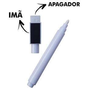 25 Canetas Giz Líquido Branca para Quadro Preto com Apagador e Imã Cor: Branco As canetas podem ser usadas em quadro preto, em vidros e em outras superfícies lisas, na ponta da tampa encontra-se uma espuma para apagar e na lateral um imã que permite que grudem em superfícies metálicas. Recomendamos apagar somente após a tinta estar totalmente seca, caso necessário utilizar um pano úmido.