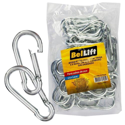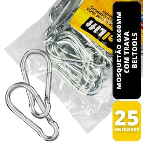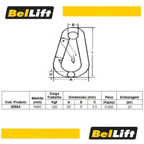 Comprimento total: 60mm. Diâmetro do corpo: 6mm. Carga de trabalho: 80kgf. Material: Aço carbono. Acabamento: Galvanizado.