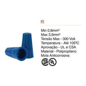 250 conectores de torção emenda para fios cabos - azul os conectores de torção emendam cabos flexíveis e fios rígidos de forma prática e segura. Ao contrário da fita isolante que resseca com o calor e o tempo os conectores mantém a emenda isolada por muito mais tempo. Protegida por uma capa isolante, encontra-se a mola interna que se expande para acomodar firmemente os condutores e os mantém unidos sob pressão constante, sem danificá-los, para soltar os fios basta girar o conector no sentido anti-horário, podendo ser em outra conexão. Especificações aplicação: 0,8 a 3,9mm soma dos cabos, ex: fio 1,0mm + cabo 1,5mm=2,5mm temperatura: até 105ºc. Voltagem: até 300 volts aprovação ul/csa