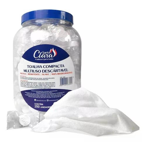 A Toalha Desidratada Santa Clara Compacta Descartável é higiênica e descartável, utilizada para limpeza das mãos, do rosto, remover maquiagem, cosméticos, limpar a pele de uma forma geral, é macia e absorvente, ela pode ser utilizada para a limpeza de aparelhos e/ou móveis sensíveis a riscos. Ela é uma toalha multiuso que se encaixa à sua necessidade.