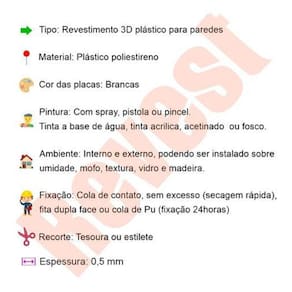 1- Você mesmo consegue instalar, não precisa de um ; 2- Material resistente, o relevo não amassa e não afunda; 3- Instalação sem sujeira e sem quebra quebra; 4- Ideal para paredes com umidade, mofo, textura, madeira e azulejo; 5- Serve tanto para áreas internas, quanto externas; 6- É lavável; 7- Durabilidade de 10 anos; 8- Não precisa de pintura; 9- Instalação com fita dupla face ou cola de contato; 10- Cortes das placas é a laser.