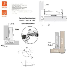 A Dobradiça tem a montagem simples, realizada através do deslizamento da dobradiça sobre o calço, que possui regulagem lateral vertical e horizontal para melhor alinhamento das portas e é fixada no calço de fixação no sistema slide-on (deslizante)