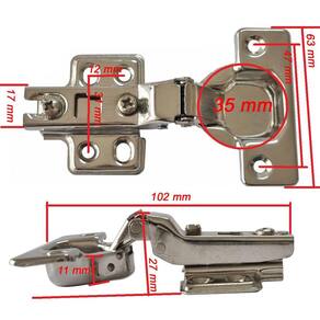 Dobradiça caneco 35mm em aço inox para portas de armário. Quantidade: Kit com 2 dobradiças caneco 35mm 8 parafusos Dobradiça inox curva kit c/2 Esta dobradiça caneco de 35mm, fabricada em aço inox de alta qualidade, é a escolha ideal para quem busca durabilidade e resistência à corrosão. Perfeita para portas de armários de cozinha, banheiro ou qualquer outro móvel, proporciona um fechamento seguro. Com design discreto, oferece ajuste preciso, garantindo a funcionalidade e a estética dos seus móveis. Instalação fácil e compatível com uma ampla variedade de materiais, esta dobradiça é a solução definitiva para quem deseja unir praticidade e estilo. São indicadas para móveis com portas sobrepostas que necessitam de um fechamento total, isto é, móveis simples de duas portas ou módulos de roupeiros modulados. Além disso, as dobradiças retas possuem uma limitação de abertura, ou seja, elas não abrem ângulos maiores que 90º Dobradiça em aço inox 201 calço fixo curvo com parafusos Benefícios: As dobradiças possuem design funcional permite o fechamento suave e silencioso das portas. São ideais para uso em móveis, proporcionando maior durabilidade às portas. Aplicações: Indicado para uso em móveis, para instalação de portas em armários, gabinetes, estantes e etc. Capacidade: A dobradiça é ideal para portas de 16 a 24mm; com duas dobradiças, suporta 25 kg. Características: Indicado para uso em móveis, para instalação de portas em armários, gabinetes, estantes e etc. Material: aço inox 201 com parafusos Medidas 111 x 62mm Caneco: diâmetro 35mm, profundidade 11,5mm. Entre furos 48mm Ângulo de abertura 90º Calço fixo duplo 4 furos . Entre furos 33mm do vendedor: 3 meses do vendedor: 90 dias