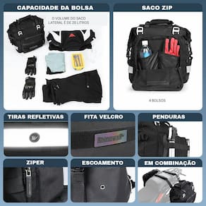 2 bolsas laterais com volume expansível de 20 a 25 litros cada - para alforge universal - impermeável - para todas as motos - bag para assento - a prova de água - rhinowalk Para todas as motos - universal - capacidade expansível de 20 a 25 litros por bolsa. Principais características - material antiderrapante e resistente ao desgaste: protege o suporte da moto e evita danos à pintura. - instalação super fácil e rápida: sem necessidade de ferramentas - basta fixar o gancho e a alça no rack - grande capacidade e organização: volume fechado de 20l, expansível para 25l. Possui bolsos internos e externos para armazenar seus itens com praticidade. - impermeável e à prova dágua: bolsa interna removível com fita prensada a quente e proteção contra pressão de água de 6000 mm - sem preocupações em dias chuvosos - uso versátil: pode ser utilizada como bolsa de motocicleta, bolsa de mão ou bolsa de ombro - perfeita para viagens de ônibus, carro, caminhão e até caminhadas. - segurança reforçada: impressão reflexiva para maior visibilidade à noite. - sistema de ajuste inteligente: compatível com motocicletas com rack lateral de 10-23 mm, podendo ser instalada mesmo com tubos de escape. - pode ser Utilizado individualmente ou em par - conforme sua necessidade Informações técnica - marca: rhinowalk - modelo: 2040 - material: poliéster - dimensões individuais: 35x35x15 cm - peso líquido individual: 1,15 kg - dimensões da embalagem: 41,5x36,6x19 cm - peso da embalagem: 3 kg - cor: verde-musgo - itens inclusos 2 bolsas impermeáveis para moto - rhinowalk 20l cada 2 alças de transporte/ombro Alças de ajuste e espaçadores Marca: Não Informado