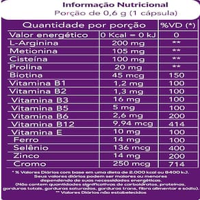 Ingredientes: ácido ascórbico vitamina c , bisglicinato de cobre, bisglicinato ferroso, d-biotina, dl-alfa-tocoferol vitamina e , sulfato De zinco, selenito de sódio, tiamina mononitrato vitamina b1 , riboflavina vitamina b2 , nicotinamida niacina , pantotenato de cálcio vitamina b5 , cloridrato de piridoxna vitamina b6 , cianocobalamina vitamina b12 , amido, estabilizante celulose microcristalina, antiumectante dióxido de silício.