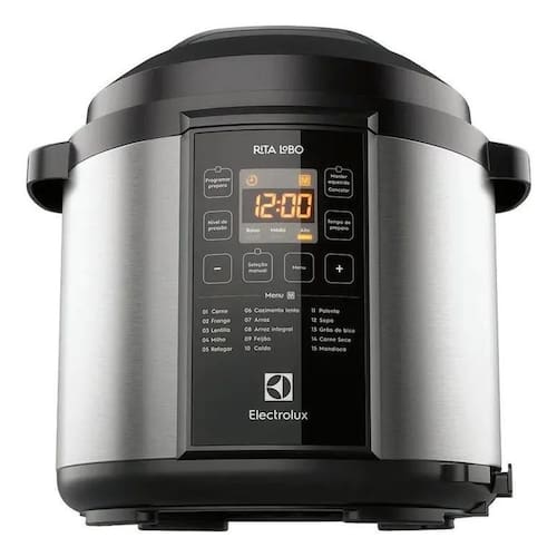 Panela de pressão elétrica digital com 6L de capacidade. Possui função manter aquecido, timer, desligamento automático, cuba removível e antiaderente, tampa com trava de segurança e saída de vapor. Inclui acessórios como copo medidor e bandeja para cozimento a vapor.Lâmpada piloto