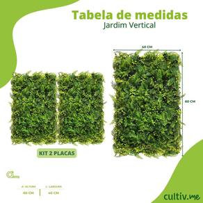Características * Aparência Realista: Folhagens com mescla de tonalidades aparência natural * Versatil: Perfeita para decoração de festas, eventos, varandas, escritórios, áreas de lazer e muito mais. * Material: Plástico de alta durabilidade, resistente. * Dimensões: 60 cm de altura por 40 cm de largura. * Instalação: Pregos, parafusos, abraçadeiras de nylon ou ganchos * Kit: 2 Placas