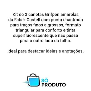 Descrição Com 3 Canetas Pincel Marca Texto Amarelo Faber Castell Grif Pen, você pode escrever com estilo e precisão. A ponta pincel permite traços finos e grossos a depender da pressão colocada no papel. O formato triangular garante maior conforto ao escrever e a tinta não passa para o outro lado da folha. Ideal para usar na escola, universidade ou no escritório.
