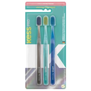 As escovas da linha Kess Pro possuem: Alta eficiência na escovação- tem o maior número de cerdas de alta qualidade que garantem limpeza profunda dos dentes, projetadas para alcançar até mesmo os espaços mais difíceis, alcançando áreas inacessíveis pelas escovas comuns. Garantindo limpeza completa. Cerdas extra macias e ultrafinas que proporcionam uma escovação gentil. A estrutura única das cerdas neutraliza a força excessiva, protegendo ainda mais as gengivas Design Moderno, estético e funcional com cabo reto e cabeça angulada Economia: Pack triplo para maior durabilidade acompanha capa protetora de cerdas. Proporciona precisão e conforto na escovação.