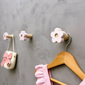 A face vai colada com super cola e acaba sendo apenas decorativa, pois é o suporte quem recebe o esforço, suportando até 5 Kg. Anúncio referênte à 3 unidades. Modelo: Flor Tamanho da face: 5,0cm X 5,0cm; Material: MDF laminado 15mm melamínico | borda pintada Cor: Rosa, Azul, Branco e Cinza