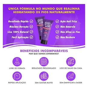 Hidraliso leia o anúncio com atenção Hidraliso mudou a sua embalagem , para poder atender os clientes com melhor qualidade, onde a embalagem antiga algumas estavam soltando o rotulo na parte de baixo, como a marca hidraliso preza muito a qualidade para seus clientes, a embalagem nova não vamos ter mais esse problema, mas podem ficar tranquilas que produto continua com a mesma qualidade e eficácia, qualquer duvida estamos a disposição.Ação instantâneaA progressiva de chuveiro é um alisante capilar 100% natural livre de formol, e apresenta em sua formulação, alta concentração de um inovador composto hidrolisado que proporciona: alisamento instantâneo, de simples uso no banho . restauração e fortalecimento dos fios manutenção e efeito liso natural. retexturização selamento da fibra capilar. condicionamento e brilho intenso. ação anti-frizz não deixa o cabelo pesado. alta hidratação, cabelos macios e sedosos. sem formol não desbota os fiosexperiência do liso perfeito em poucos minutosJá imaginou ter mais tempo livre para aproveitar seus melhores momentos de forma diferente Produto de aplicação rápida com efeito instantâneo que é sucesso nas redes sociais chegou facilitar os seus dias chega de gastar, a solução está em suas mãos.Perguntas frequentes:O que é hidra lisoUm alisante de efeito rápido.O hidra liso contém um mix de ativos hidrolizados que agem sinergicamente nas cadeias sulfídicas dos fios, realinhando e deixando o cabelo mais mais firme e hidratado. Quer saber o segredo de como alisar seus cabelos em minutos Já descobriu.Quem pode usar, tem contra-indicaçãoO hidra liso possui uma fórmula desenvolvida com ativos 100% naturais e não possui contraindicação; em caso de gestante ou mulheres que amamentam, crianças menores de 12 anos, idosas, pessoas com doenças pré existentes ou que utilizam algum remédio remédio regulamente é necessário a consulta médica antes de começar o uso do produto.Como o produto foi testadoApós anos de estudos, desenvolvemos a formulação perfeita para realinhar os fios em poucos minutos. Não testamos em animais.Qual a quantidade ideal em cada aplicação a quantidade de produto a ser aplicado depende do tamanho do cabelo. É importante lembrar que é necessário a aplicação mecha a mecha enluvando os fios, respeitando 1,5cm da raiz. E espalhar bem o produto sobre os fios.Quando tempo devo deixar o produtoÉ muito importante seguir o passo a passo descrito no verso da embalagem ou no manula indicativo que acompanha o produto. Cada cabelo necessita de um tempo de pausa específicoUnidades na embalagem: 3 Marca: Hidra Liso