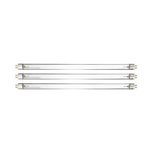 Kit 3 lâmpadas UV tubular fluorescente T5 germicida UV-C 8W para esterilização de ambientes, água e reposição filtro UVComposição do kit: 3 lâmpadas germicida de 8W T5 UV-C.Leia atentamente o anúncio antes da compra.Nossa lâmpada tubular germicida UV foi desenvolvida com tecnologia de ponta para garantir a mais alta qualidade e eficiência em desinfecção, é a escolha ideal para garantir um ambiente livre de germes e uma água cristalina para seu aquário ou lago.Principais Características:Eficácia comprovada na eliminação de bactérias, vírus e outros micro-organismos nocivosA lâmpada UV-C germicida é uma poderosa ferramenta para manter ambientes saudáveisDeixa a água cristalina do lago ou aquário Livre de produtos químicos, a luz UV-C não deixa resíduos tóxicos no ambiente, no ar ou na água tratadaPode ficar ligada 24h por diaTubular / linearTubo de quartzo transparente4 pinos, dois em cada pontaNecessita de reator próprio para lâmpada UVNecessita de equipamento próprio para desinfecção de ambientes ou um filtro UV para esterilização de águaNunca manuseie a lâmpada com ela ligada, não exponha olhos e pele à radiação da lâmpada. Aplicação - Para que serve a lâmpada ultravioleta - UV-C germicida:Peça de reposição para filtro ultravioleta UV de lago ou aquário.Manter a água do aquário ou lago cristalina e livre de micro-organismos que possam prejudicar a saúde dos peixes e plantas.Tratamento de água e esgoto.Desinfecção de ambientes como hospitais, farmácias, restaurantes, academias, transporte público, indústrias alimentícias e outros locais que necessitam manter o ambiente seguro e livre de patógenos.Especificações técnicas:Marca: Mega AquáriosModelo: Lâmpada UV UV-C germicida fluorescente ultravioleta 8WRadiação: Emite radiação UV de onda com um pico de 253.7 nm UV-C Potência: 8WVoltagem: 110V / 220V pode ser ligada nas duas voltagens conforme ligação do reatorTamanho: 30cm pino a pinoDiâmetro: T5Soquete: G5Pinos: 4Formato: tubularMédia de vida útil: 8.000hPeso: 31g.Necessita reator específico para lâmpada fluorescente de 8W.A lâmpada germicida também pode ser conhecida como:Lâmpada UV-C, lâmpada germicida, GL, lâmpada esterilizadora, luz ultravioleta C, luz uv.Como usar a lâmpada UV ultravioleta para esterilizar água: É necessário a utilização de um esterilizador ou filtro UV, nunca coloque a lâmpada ultravioleta UV-C diretamente na água sem um equipamento próprio. A utilização de materiais para vedação como: silicone, Durepox e outros materiais semelhantes não garantem a vedação correta, podendo passar água para os pinos e consequentemente a queima da lâmpada, caracterizando uso indevido e a perda da garantia. Utilize sempre material apropriado como anéis de vedação de borracha.Como descartar a lâmpada UV corretamente:Procure pontos apropriados de coletas específicos para materiais reciclados como lâmpadas e resíduos eletrônicos.Nunca jogue lâmpadas tubulares no lixo comum, pois elas contêm metais pesados e outros materiais perigosos.IMPORTANTEJamais exponha os olhos ou a pele à radiação emitida pela lâmpada UV ultravioleta, sob risco de danos gravíssimos irreversíveis aos olhos além de queimaduras na pele. A utilização de equipamentos de segurança é obrigatória.Obrigado pela visita e boas comprasATENÇÃONossas imagens e textos são registrados e com direito de uso autoral controlado e reservado a essa loja e as lojas parceiras devidamente autorizadas em contrato.