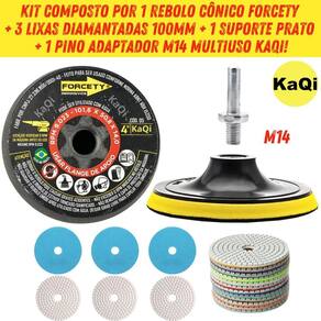 3 Lixas Grão 4 Pol. 100mm Diamantada + 1 Rebolo Cônico 45 Graus + 1 Disco Prato + 1 Pino M14 KaQi GRÃO: g400 g800 g1500 Kit 3 Lixas Diamantadas Disco 4 Polegadas 100mm KaQi + 1 Rebolo Grão 120 Copo Cônico 45 Graus 4 Polegadas M14 Forcety. + 1 Suporte Prato Disco 100mm M14 KaQi + 1 Pino Adaptador Multiuso Rosca Universal M14 KaQi. Para Desbastes, Polimentos, Acabamentos, Boleamentos, Lixamentos a Seco e Úmido. Ideal para profissionais e entusiastas de reformas e construção. Transforme o acabamento das suas superfícies com o Kit 3 Lixas Grão 4 Pol. 100mm Diamantada + 1 Rebolo Cônico 45 Graus + 1 Disco Prato + 1 Pino M14 Desenvolvido para oferecer o melhor polimento e acabamento, é perfeito para quem busca resultados profissionais, tanto em pedras como granitos, mármores, cerâmicas, quanto ardósia, calcário, dekton, quartzo, porcelanato, pedra projetada, concreto, nanoglass, super nano, vidro e muito mais. Seu lixamento pode ser a seco e a úmido, o que proporciona um processo mais rápido, sem gerar calor excessivo. Assim, é possível garantir um resultado sem manchas ou falhas, e ainda favorece um efeito brilho d'água incrível O Rebolo Copo Cônico 10x5cm Grão 120 Forcety é ideal para desbastes, retificações, boleamentos e acabamentos. Projetado para oferecer eficiência, durabilidade, confiabilidade e resultados excepcionais, é perfeito para profissionais e entusiastas de reformas e construções. Não à toa, é o rebolo número 1 das marmorarias, azulejistas e oficinas de todo Brasil O Disco 100mm e o pino adaptador M14 podem ser utilizados em conjunto com as lixas e com o rebolo. Com sistema de gruda e desgruda fácil, podem utilizadas em lixadeiras, esmerilhadeiras, politrizes, furadeiras, parafusadeiras. Permite, assim, ampliar a gama de usos do kit. Principais características: 1. Durabilidade extra, alta resistência ao desgaste, longa vida útil e desempenho, além de excelente performance em diversos tipos de materiais. 2. Acabamento impecável no desbaste e polimento de superfícies de pedra, mármore, calcário, ardósia, porcelanato e outros, sem deixar manchas ou marcas indesejadas. Pode ser trabalhada em superfícies claras ou escuras. Oferece uma remoção eficiente de material e um acabamento uniforme. 3. Versatilidade no uso com diversas ferramentas, já que pode ser Utilizado em esmerilhadeiras, lixadeiras, politrizes e furadeiras elétricas. 4. Eficiência de montagem, uma vez que possui sistema de fixação rápido. Basta encostar a lixa no suporte do disco para grudar, e, para remover, é só puxar na direção contrária. Conteúdo da embalagem: 3 Lixas DÁgua 4 Pol. 100mm Disco Diamantado KaQi GRÃO. + 1 Rebolo Grão 120 Copo Cônico 45 Graus 4 Polegadas M14 Forcety. + 1 Suporte Prato Disco 100mm M14 KaQi + 1 Pino Adaptador Multiuso Rosca Universal M14 KaQi. Especificações Lixas: Diâmetro: 100mm 4 Polegadas . Furo central: 1,3cm diâmetro. Espessura 1 unidade: 0,4cm. Maleabilidade: flexível. Lixamentos: seco e úmido. RPM: ideal entre 3000 a 5000 rotações por minuto. Material da lixa: diamante sintético industrial e resina premium. Costado: tipo vellcro. Fácil de fixar e remover. Especificações Rebolo: Trabalho: a seco ou refrigerado com água. Diâmetro: 4 Polegadas 100mm 10,16cm x altura 5,08cm. Velocidade: 9023RPM. Rosca: M14. Material: Carbeto de Silício SiC com diamantes. Norma ABNT NBR 15230. Especificações Prato Suporte: Diâmetro do disco: 100mm 4 Polegadas . Modelo do disco: M14 com superfície tipo vellcro. RPM: até 12000. Rosca: padrão M14 14mm . Especificações Pino Adaptador M14: Para Furadeira Parafusadeiras, Politrizes, Lixadeiras e Esmerilhadeiras. Fixa em discos pratos M14 para uso com lixas, boinas, espumas de polir, entre outros acessórios. Rosca: M14 14mm . Pino largura: 8mm. Altura total: 4,4cm.