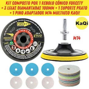 3 Lixas Grão 4 Pol. 100mm Diamantada + 1 Rebolo Cônico 45 Graus + 1 Disco Prato + 1 Pino M14 KaQi GRÃO: g100 g200 g200 Kit 3 Lixas Diamantadas Disco 4 Polegadas 100mm KaQi + 1 Rebolo Grão 120 Copo Cônico 45 Graus 4 Polegadas M14 Forcety. + 1 Suporte Prato Disco 100mm M14 KaQi + 1 Pino Adaptador Multiuso Rosca Universal M14 KaQi. Para Desbastes, Polimentos, Acabamentos, Boleamentos, Lixamentos a Seco e Úmido. Ideal para profissionais e entusiastas de reformas e construção. Transforme o acabamento das suas superfícies com o Kit 3 Lixas Grão 4 Pol. 100mm Diamantada + 1 Rebolo Cônico 45 Graus + 1 Disco Prato + 1 Pino M14 Desenvolvido para oferecer o melhor polimento e acabamento, é perfeito para quem busca resultados profissionais, tanto em pedras como granitos, mármores, cerâmicas, quanto ardósia, calcário, dekton, quartzo, porcelanato, pedra projetada, concreto, nanoglass, super nano, vidro e muito mais. Seu lixamento pode ser a seco e a úmido, o que proporciona um processo mais rápido, sem gerar calor excessivo. Assim, é possível garantir um resultado sem manchas ou falhas, e ainda favorece um efeito brilho d'água incrível O Rebolo Copo Cônico 10x5cm Grão 120 Forcety é ideal para desbastes, retificações, boleamentos e acabamentos. Projetado para oferecer eficiência, durabilidade, confiabilidade e resultados excepcionais, é perfeito para profissionais e entusiastas de reformas e construções. Não à toa, é o rebolo número 1 das marmorarias, azulejistas e oficinas de todo Brasil O Disco 100mm e o pino adaptador M14 podem ser utilizados em conjunto com as lixas e com o rebolo. Com sistema de gruda e desgruda fácil, podem utilizadas em lixadeiras, esmerilhadeiras, politrizes, furadeiras, parafusadeiras. Permite, assim, ampliar a gama de usos do kit. Principais características: 1. Durabilidade extra, alta resistência ao desgaste, longa vida útil e desempenho, além de excelente performance em diversos tipos de materiais. 2. Acabamento impecável no desbaste e polimento de superfícies de pedra, mármore, calcário, ardósia, porcelanato e outros, sem deixar manchas ou marcas indesejadas. Pode ser trabalhada em superfícies claras ou escuras. Oferece uma remoção eficiente de material e um acabamento uniforme. 3. Versatilidade no uso com diversas ferramentas, já que pode ser Utilizado em esmerilhadeiras, lixadeiras, politrizes e furadeiras elétricas. 4. Eficiência de montagem, uma vez que possui sistema de fixação rápido. Basta encostar a lixa no suporte do disco para grudar, e, para remover, é só puxar na direção contrária. Conteúdo da embalagem: 3 Lixas DÁgua 4 Pol. 100mm Disco Diamantado KaQi GRÃO. + 1 Rebolo Grão 120 Copo Cônico 45 Graus 4 Polegadas M14 Forcety. + 1 Suporte Prato Disco 100mm M14 KaQi + 1 Pino Adaptador Multiuso Rosca Universal M14 KaQi. Especificações Lixas: Diâmetro: 100mm 4 Polegadas . Furo central: 1,3cm diâmetro. Espessura 1 unidade: 0,4cm. Maleabilidade: flexível. Lixamentos: seco e úmido. RPM: ideal entre 3000 a 5000 rotações por minuto. Material da lixa: diamante sintético industrial e resina premium. Costado: tipo vellcro. Fácil de fixar e remover. Especificações Rebolo: Trabalho: a seco ou refrigerado com água. Diâmetro: 4 Polegadas 100mm 10,16cm x altura 5,08cm. Velocidade: 9023RPM. Rosca: M14. Material: Carbeto de Silício SiC com diamantes. Norma ABNT NBR 15230. Especificações Prato Suporte: Diâmetro do disco: 100mm 4 Polegadas . Modelo do disco: M14 com superfície tipo vellcro. RPM: até 12000. Rosca: padrão M14 14mm . Especificações Pino Adaptador M14: Para Furadeira Parafusadeiras, Politrizes, Lixadeiras e Esmerilhadeiras. Fixa em discos pratos M14 para uso com lixas, boinas, espumas de polir, entre outros acessórios. Rosca: M14 14mm . Pino largura: 8mm. Altura total: 4,4cm.