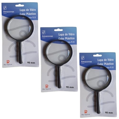Comprimento Total da Lupa: 17,5 cm Poder de ampliação: 5X Conteúdo da embalagem: 03 Lupas de Mão