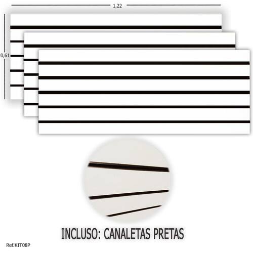3 Paineis Canaletados - 1,22 X 0,61 + Canaleta PretaPainel Canaletado Expositor em MDF, também conhecido como SlatWall, é utilizado para exposição organizada de produtos dos mais diversos segmentos.O Kit com 3 unidades de painel na medida de 1,22 x 0,61 permite que o comprador faça a instalação da maneira que melhor o convém! Isso se deve pela medida que pode compor peças maiores, adequando assim da melhor maneira para o seu negócio.DESCRIÇÃO:3 unidades de painéis canaletados 1,22 X 0,61 + Canaletas PretaESPECIFICAÇÕES:Cor: Painel BrancoMaterial: MDFMedidas Aproximadas: Painel - Comprimento de 1,22 MT // Altura de 0,61 MT // Largura ou espessura : 18mm.INSTALAÇÃO / MONTAGEM:1. Montado no sistema de parafusos direto na parede. (Parafusos e buchas não inclusos)ITENS INCLUSOS:- 3 Paineis em MDF 1,22 x 0,61 MT (Parafusos e buchas NÃO inclusos)- Canaletas Preta (Já seguem instaladas no painel)
