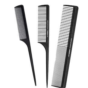 PENTE CARBONO PRO CABO FINO Possui dentes e cabo fino ideais para separação de mechas e aplicação de química no cabelo, além de ter os dentes polidos que evitam a quebra e deslizam facilmente pelo cabelo evitando o efeito arrepiado dos fios.
